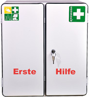 Stahlblech, Farbe weiß, zweitürig mit Sicherheitsschloss und zwei Schlüsseln, zwei Einlegeböden, zwei Schubladen, Türen mit je drei Ablageschalen, zusätzlich klappbares Ablagetableau zur hygienischen Zwischenlagerung von Verbandmaterial bei der Erste-Hilfe-Leistung, Inneneinrichtung kann durch ein Medikamentenfach, einen zusätzlichen Einlegeboden und bis zu vier Schubladen erweitert werden